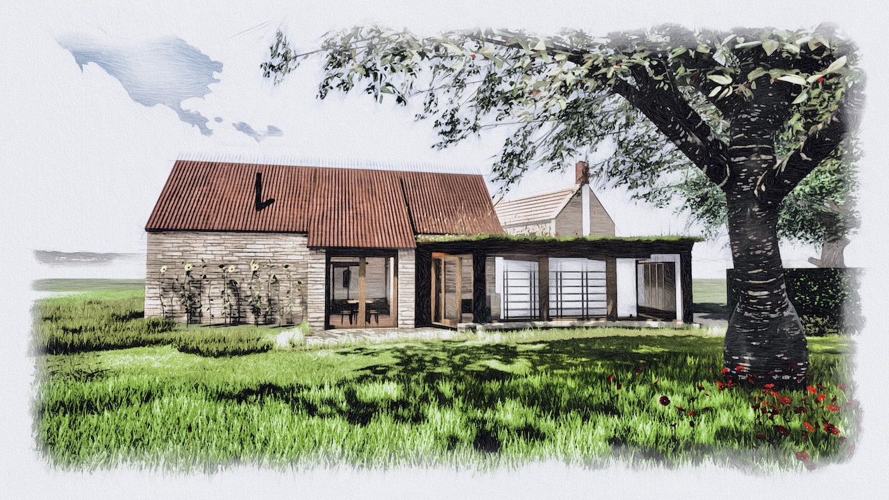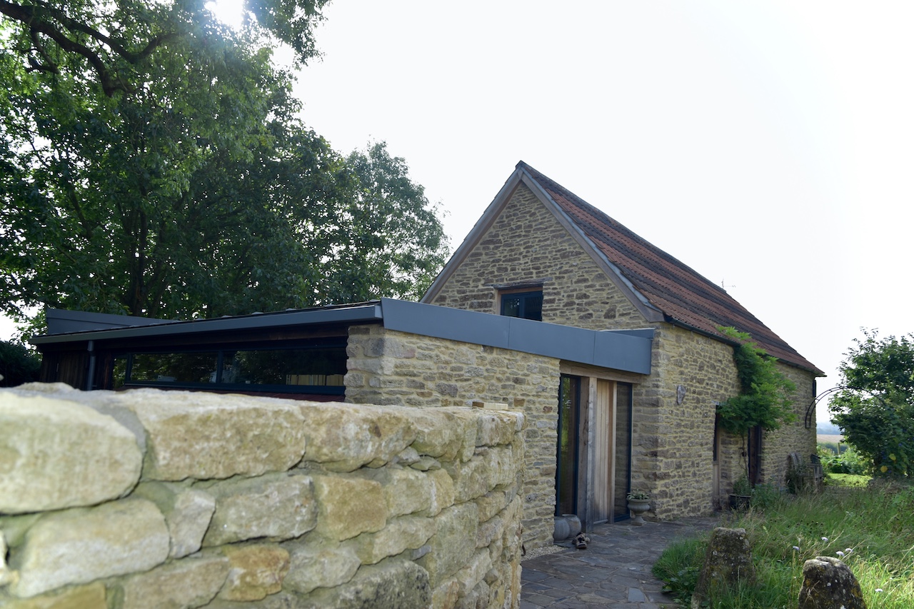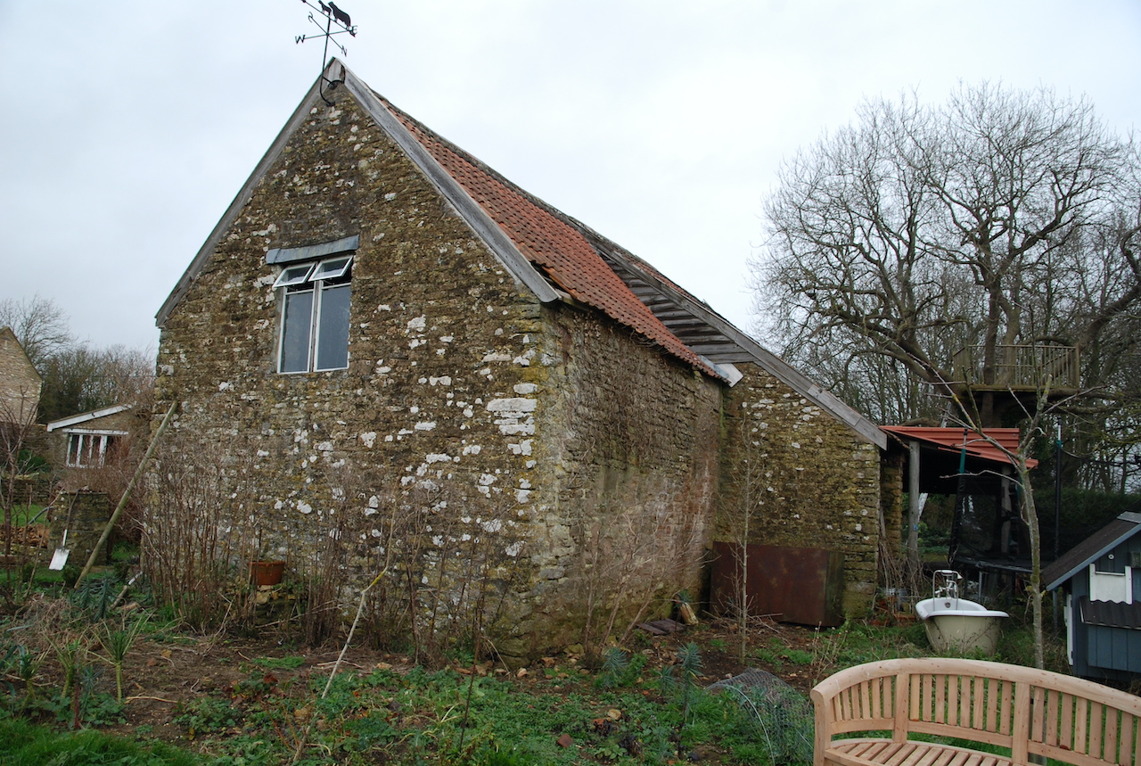 A collapsing barn and a dilapidated corrugated steel shed were the unpromising starting points for this conversion and extension to a self-contained garden annex for an artist. The site enjoys stunning views across hills to the Westbury White Horse. The artists studio extension was conceived as a curve to focus on a mature Walnut tree, without compromising the roots. The result is a cosy, super-insulated residence, with the beautifully renovated and repaired barn; a giant party space, complete with automated movie screen and minstrels gallery over.