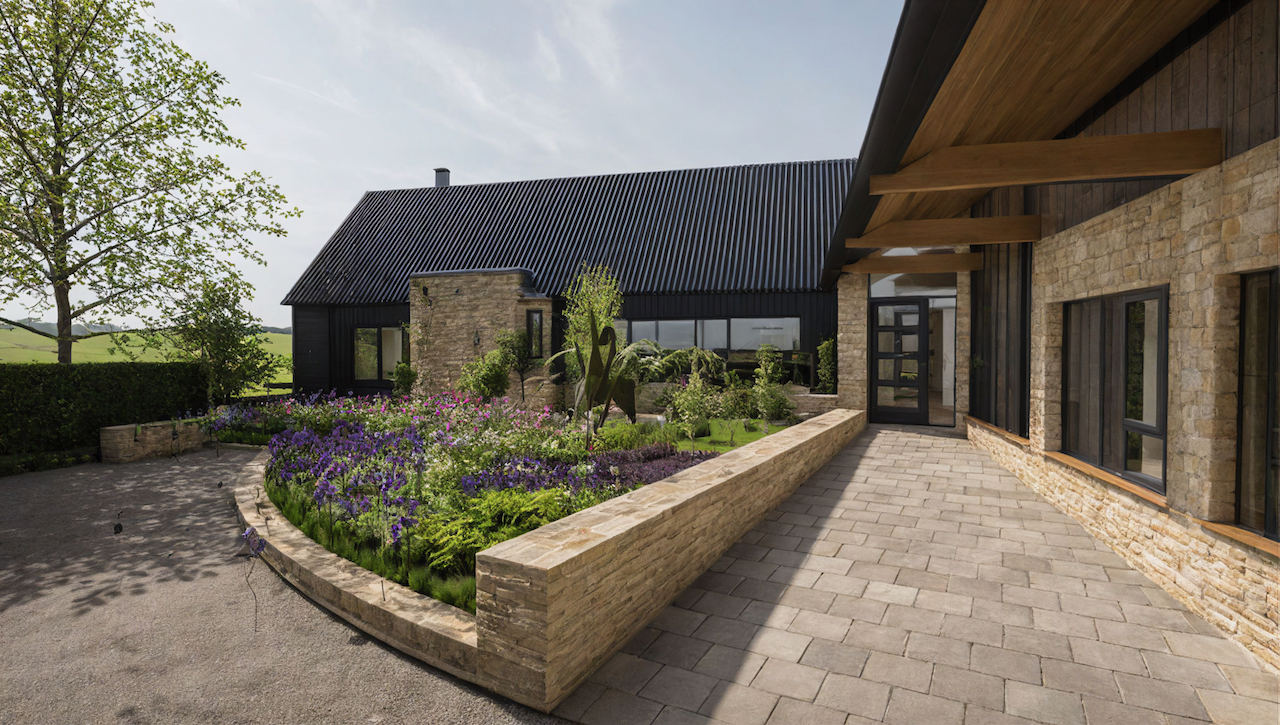 A new contemporary wing creates a welcoming covered entrance and forecourt. The extension accommodates a large open-plan family kitchen, dining room, play area, gallery, sitting room snug, with a first floor study over. It also connects to a highly renovated workshop and garage, converted to provide a guest wing. The entire project was built and managed by the owners, while living on site with their growing family, a triumph of their many skills!