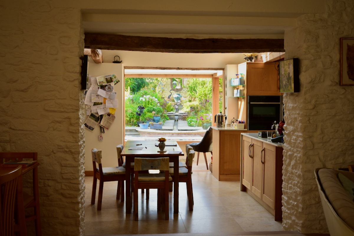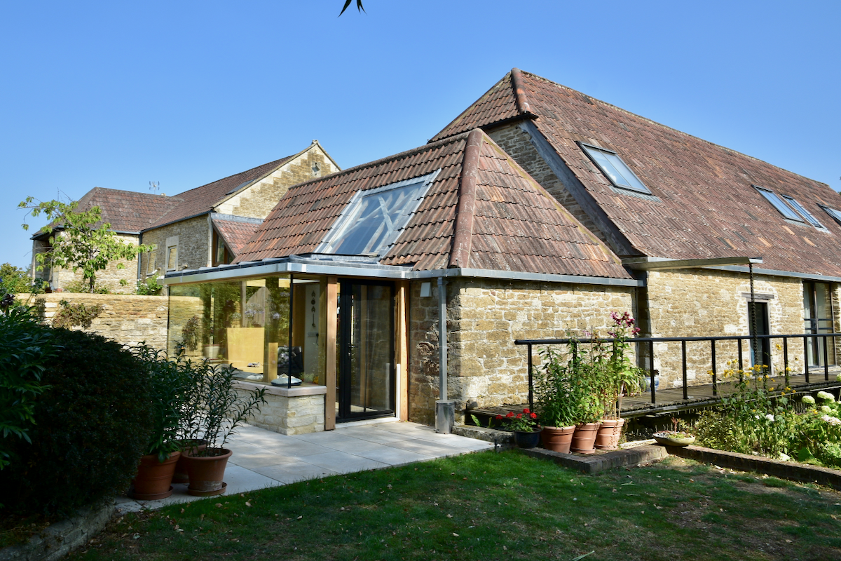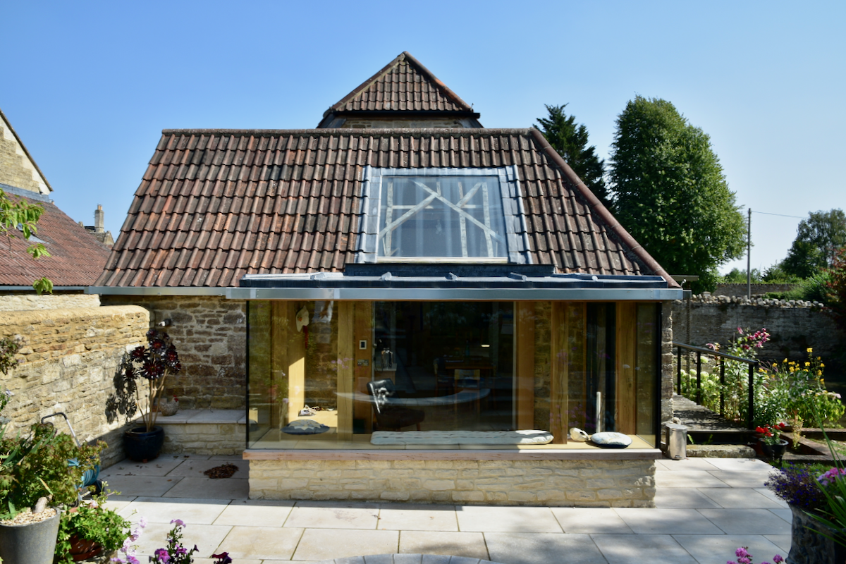 Following a flood this Listed Barn was extended to provide a better connection to the formal garden as part of flood resilience measures. It creates uninterrupted views using an internal oak frame with glass to glass corners.