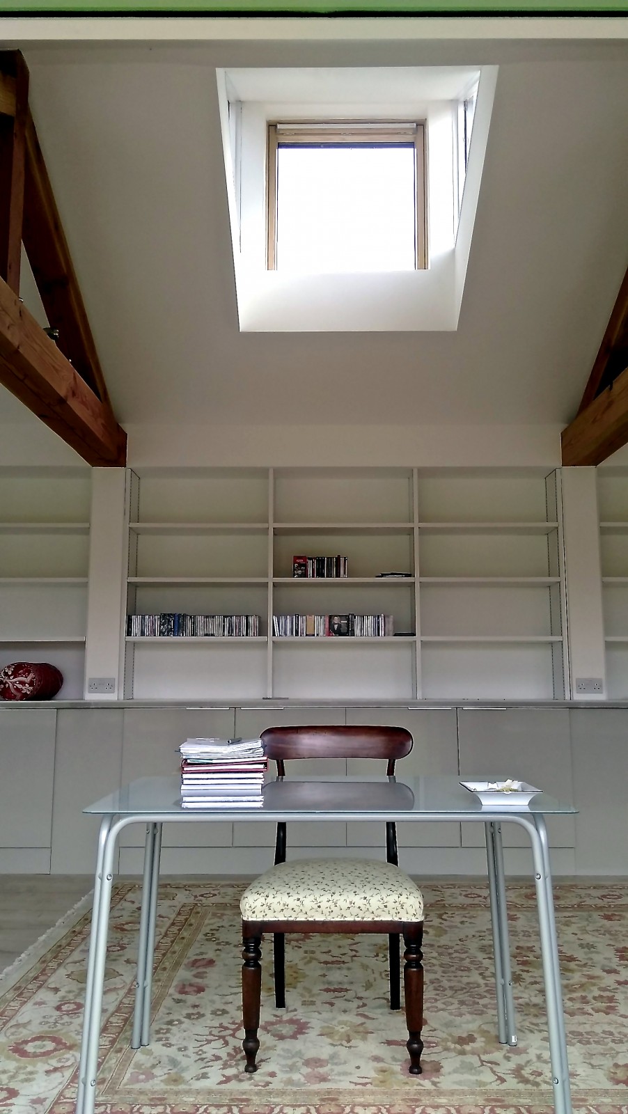 The pavilion uses rubble stone and cedar walls with a re-used clay tiled roof. This harmoniously co-exists with the main listed house (a previous project), while creating a distinct and appropriate modern pavilion. A south facing roof lantern lights the north facing music room throughout the day.