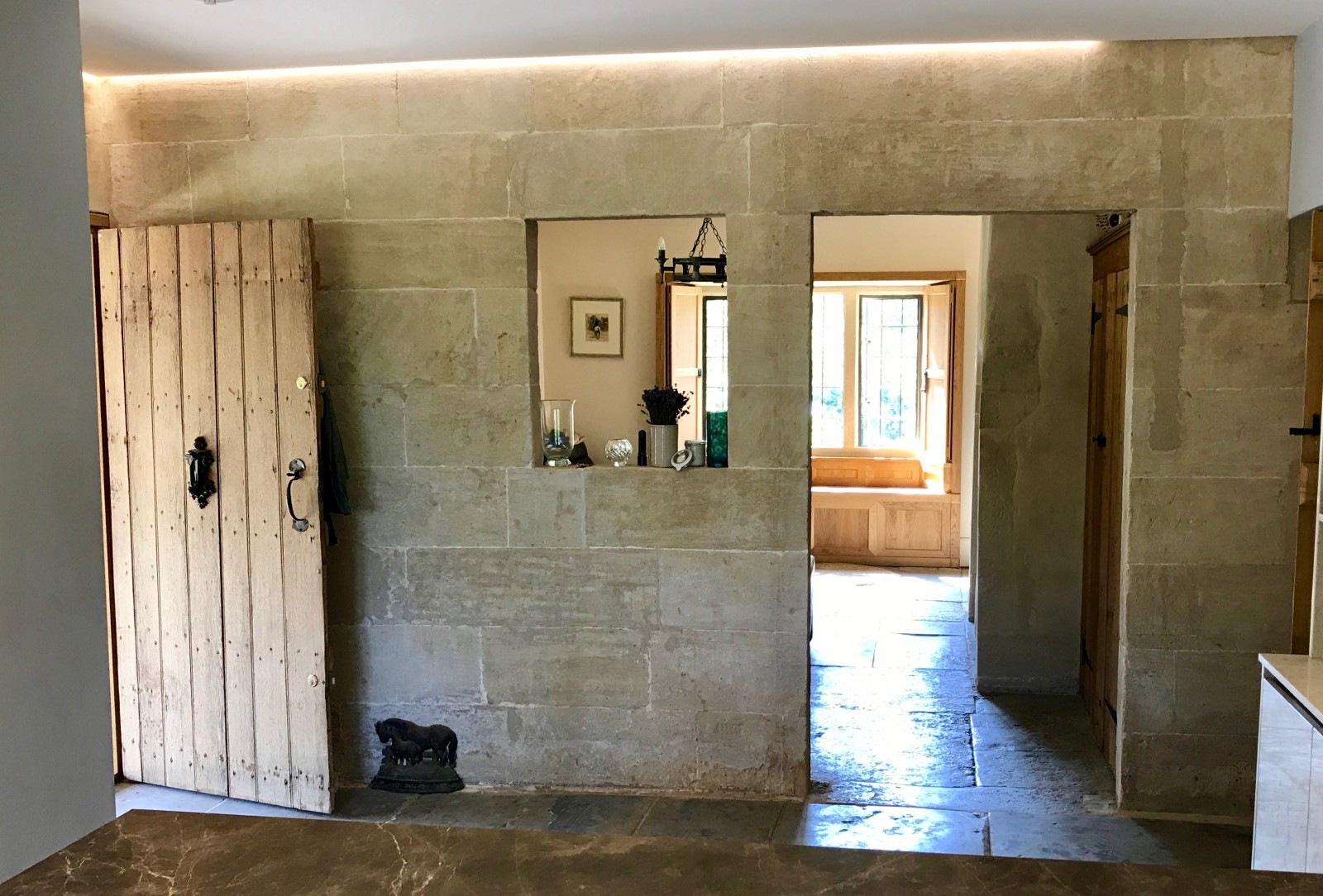 Manor Farm is a delightful Listed 18th Century 'model' farm on the site of and incorporating remnants of a former Manor. The buildings and grounds are currently undergoing major refurbishment and alterations in close liaison with the conservation officer. Sensitive stonework repair has been undertaken by specialist masons. All the roofs were stripped, repaired and retiled; the lean-to loggia and dovecot were extensively repaired and re-roofed with stone slates, the original material. Replacement and additional bespoke metal framed leaded light casements have been installed in Daulting stone or Oak surrounds . All the services were completely renewed throughout the house, with new bathrooms and kitchen have been sensitively incorporated.