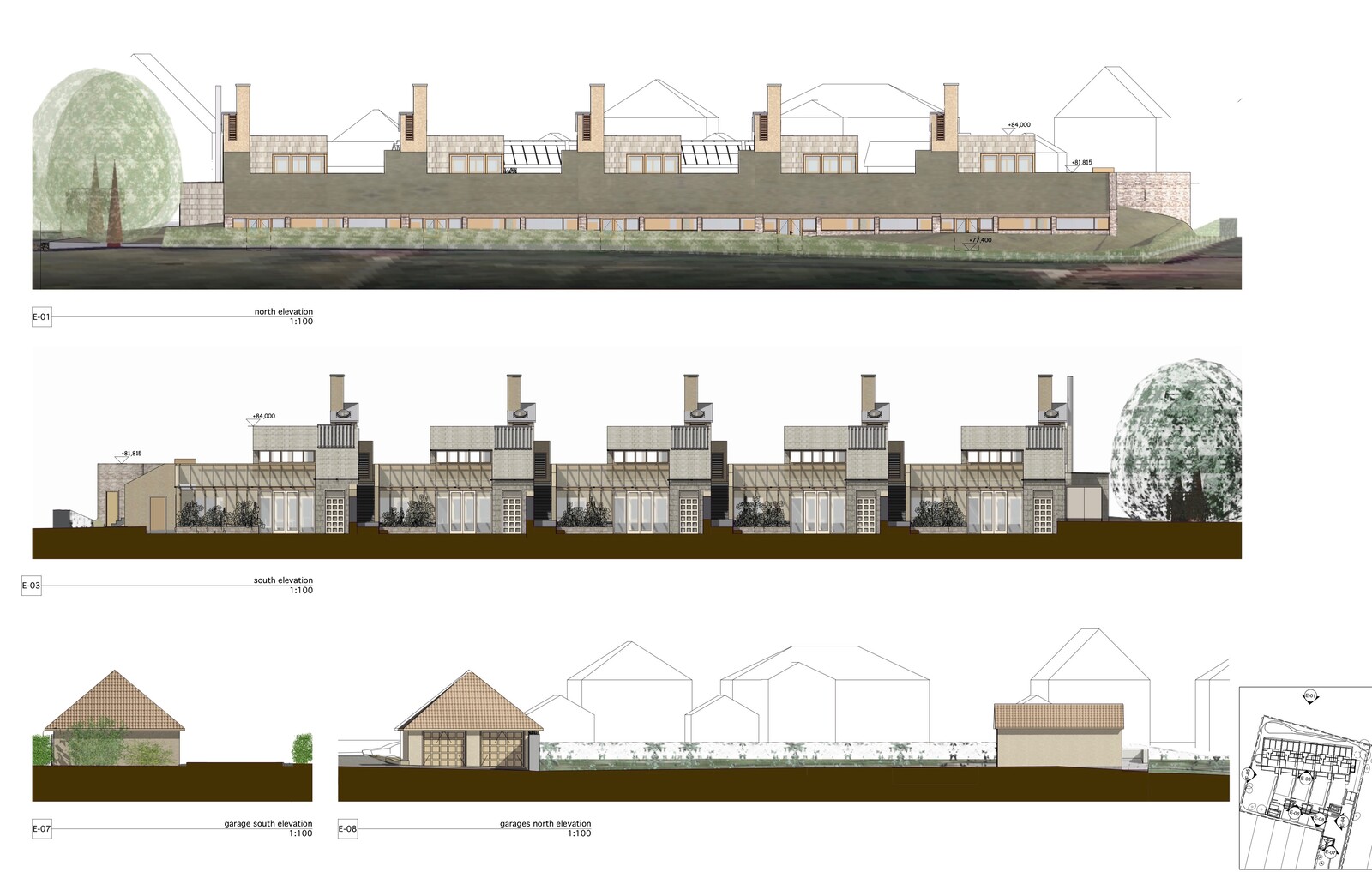 An edge of town site for five innovative ecohouses. The design maximises the southerly aspect with a zero-carbon approach to materials selection. The scheme continues the contours of the escarpment to create a rural edge to the town.