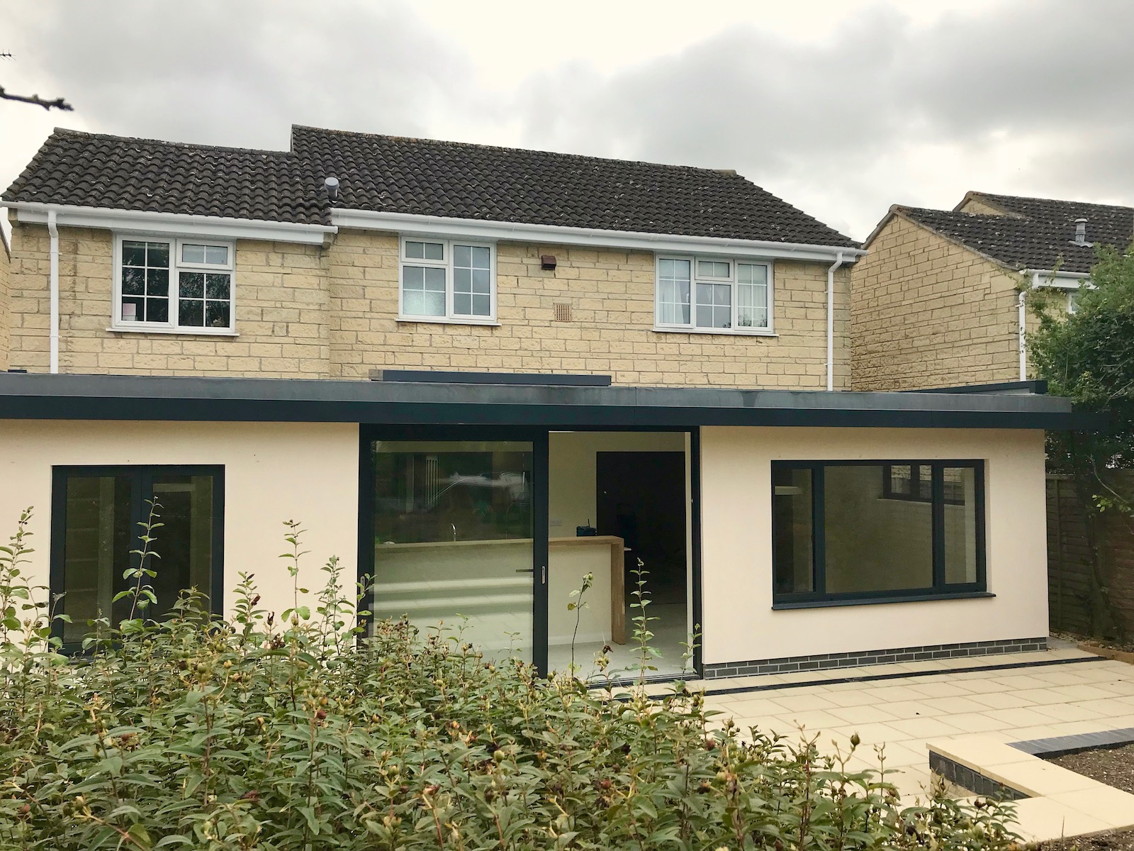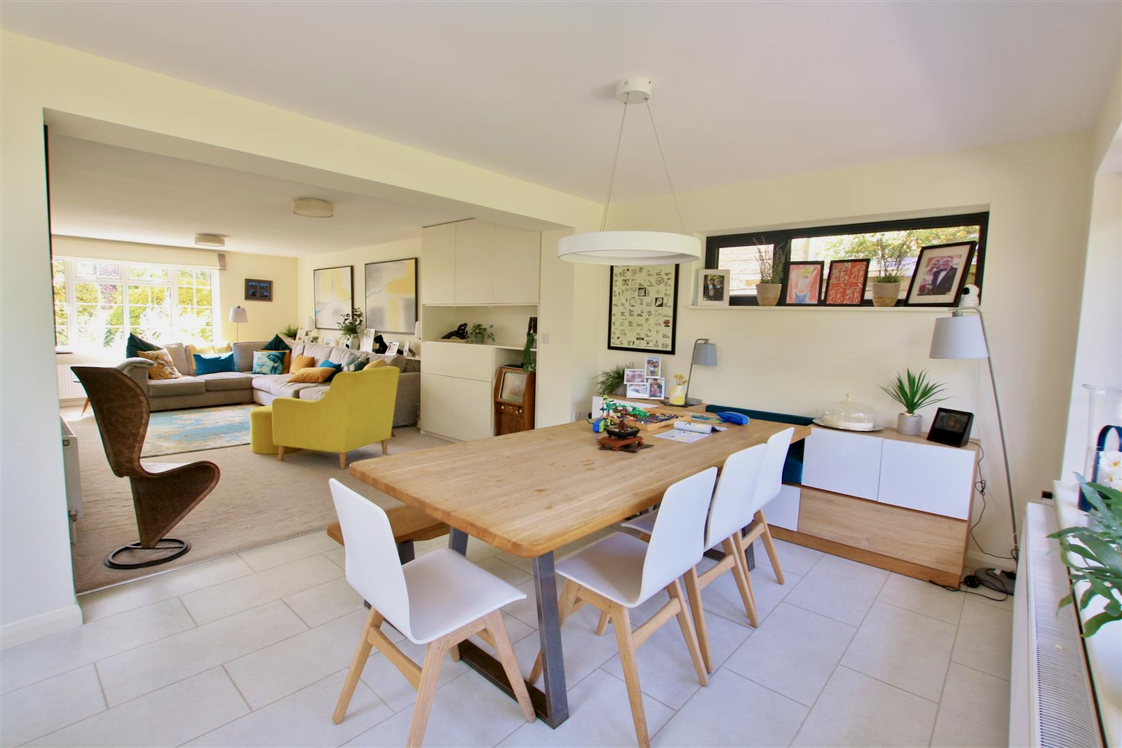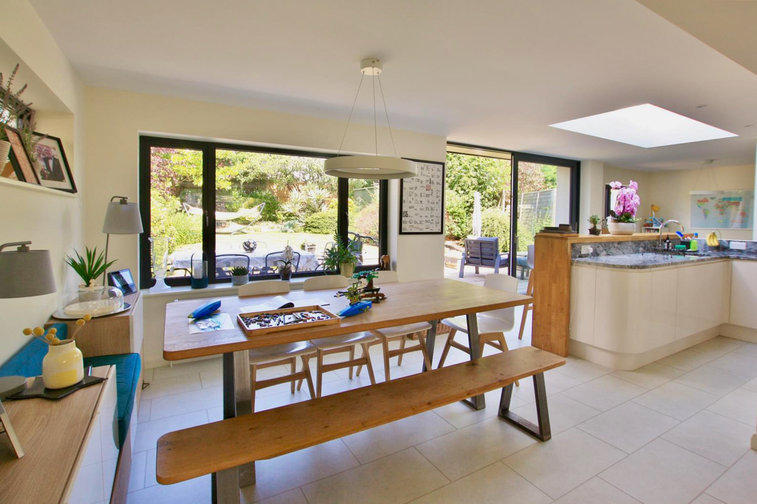 This 1970's estate home was too cramped for the growing family. After exploring several options for extending the ground floor and bedrooms, the back of the house was opened up to create a large open family room with dining area, kitchen and living room, a new cloakroom with shower and adequate coat and boot store. What a transformation!