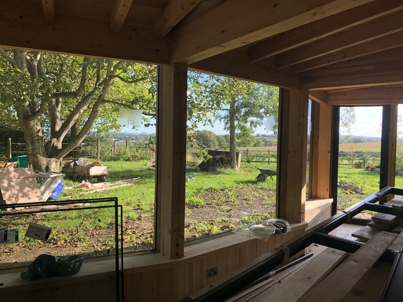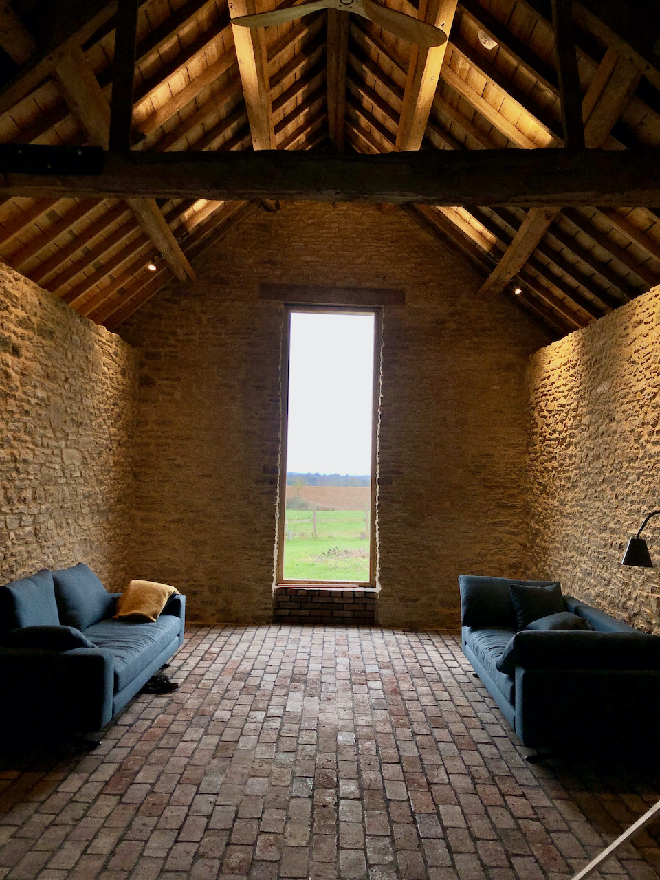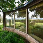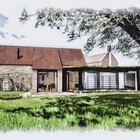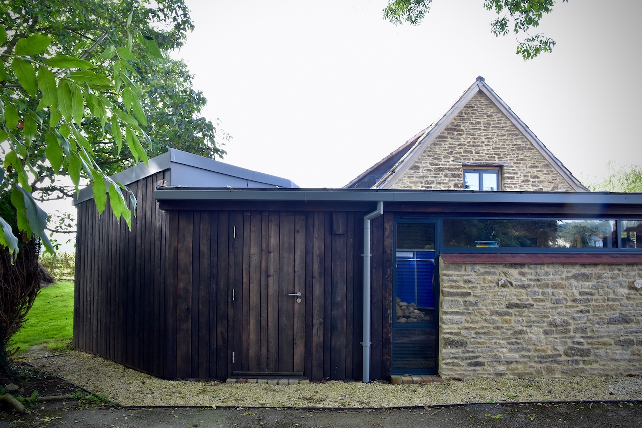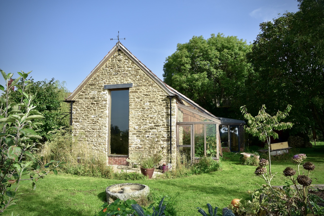 A collapsing barn and a dilapidated corrugated steel shed were the unpromising starting points for this conversion and extension to a self-contained garden annex for an artist. The site enjoys stunning views across hills to the Westbury White Horse. The artists studio extension was conceived as a curve to focus on a mature Walnut tree, without compromising the roots. The result is a cosy, super-insulated residence, with the beautifully renovated and repaired barn; a giant party space, complete with automated movie screen and minstrels gallery over.