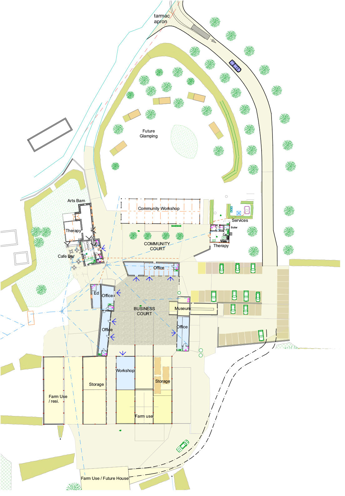 We investigated a mixed-use for the site, with glamping (via license), community spaces, offices to rent, a museum & restoration of all the original farm buildings. The long term plan was for a rural retreat. These proposals would provide a flexibility of uses to allow the business to grow & change.