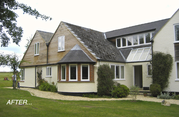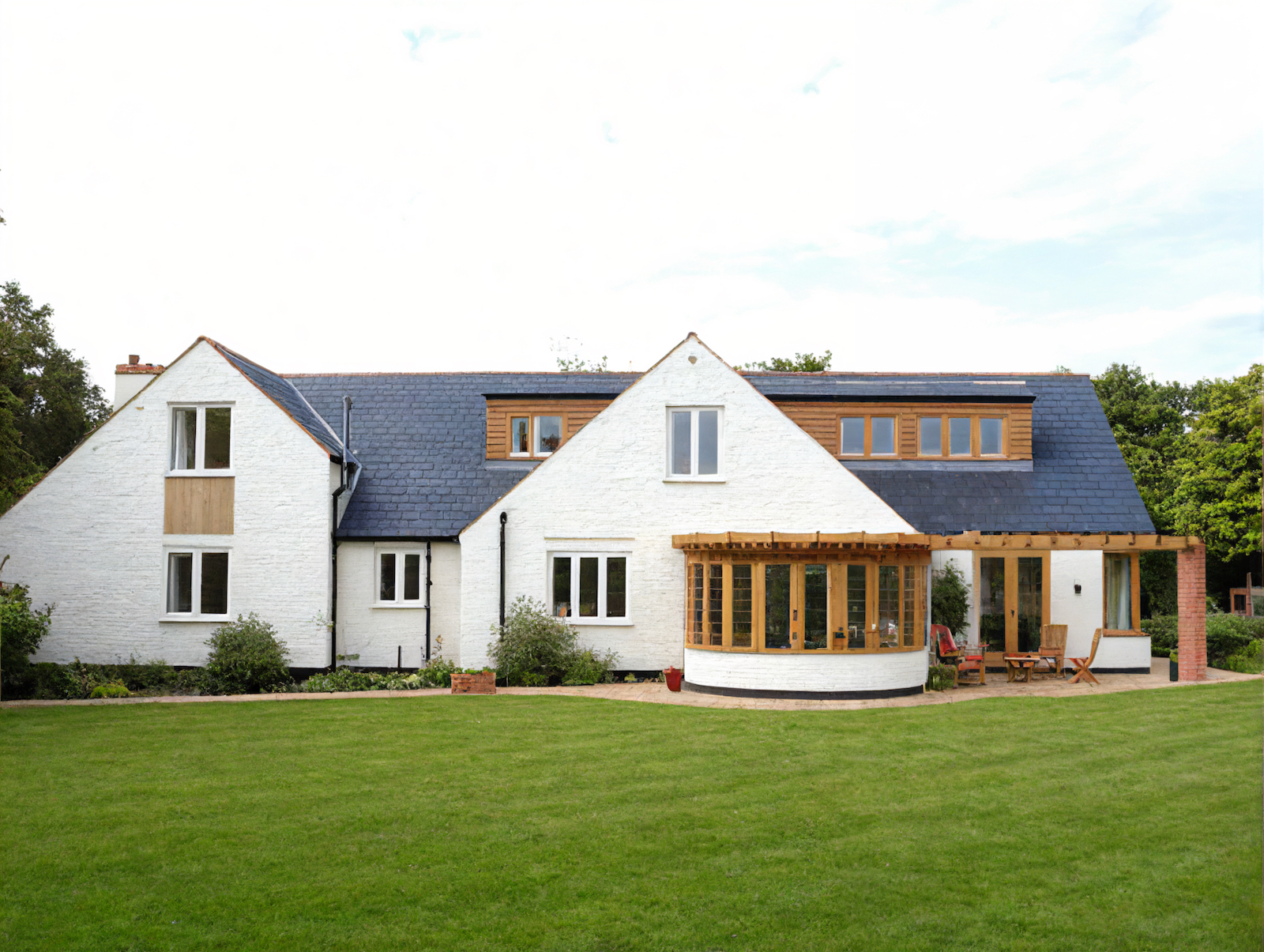 This grew from a 1950’s farmworker’s bungalow to a comfortable 5 bedroom house. It now benefits from a ground source heat pump supplying ample hot water and heating. The new family room which links with the garden comfortably hosted 24 for Christmas dinner.