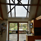 Following a flood this Listed Barn was extended to provide a better connection to the formal garden as part of flood resilience measures. It creates uninterrupted views using an internal oak frame with glass to glass corners.