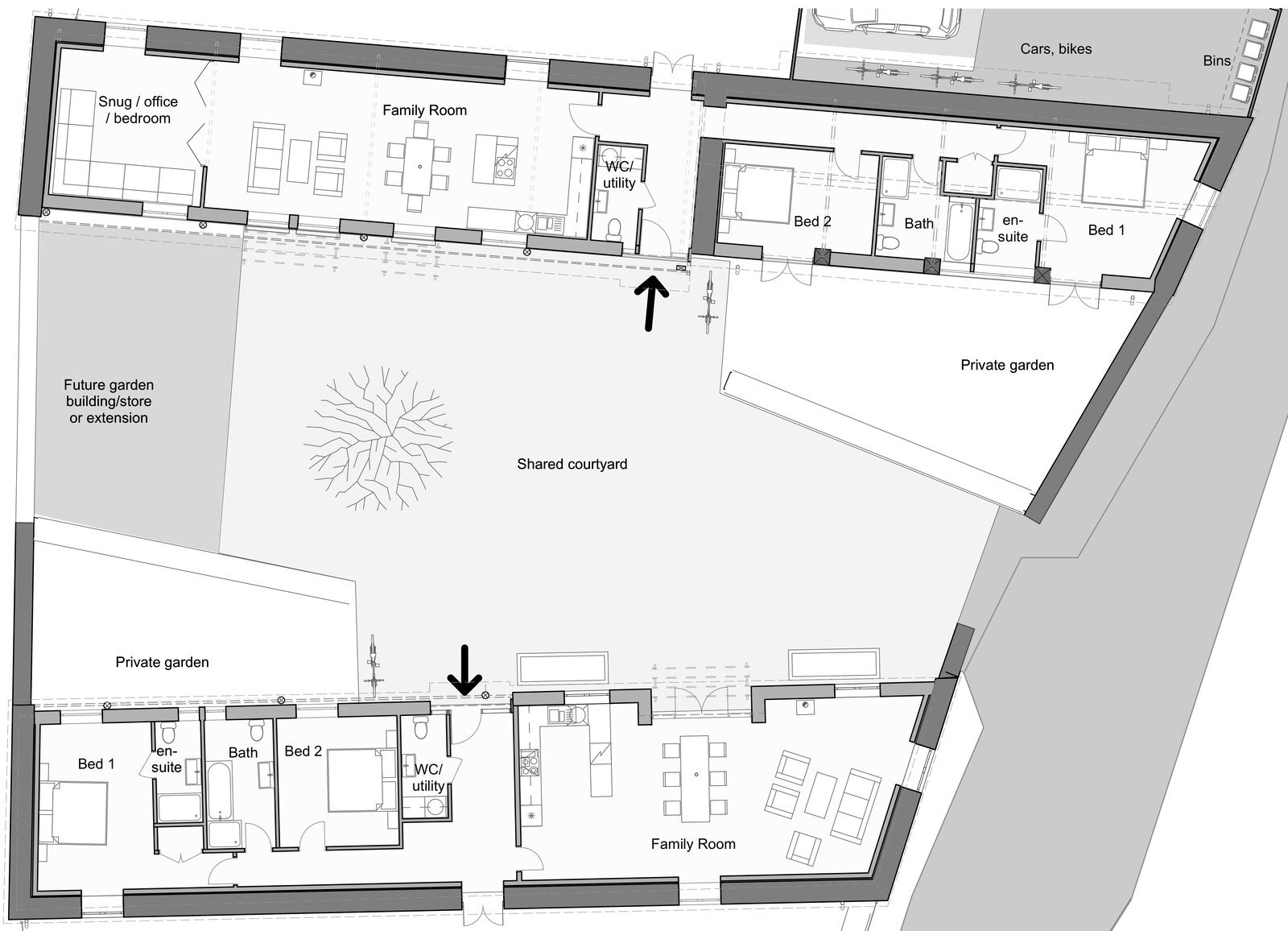 A pair of outbuildings commanding a run-down courtyard, in idyllic farmland with an adjacent river. Our client wanted to create a pair of low-impact homes for two families. The barns are in sound condition but with some design challenges. Consent was achieved and this project is due to commence in 2021.