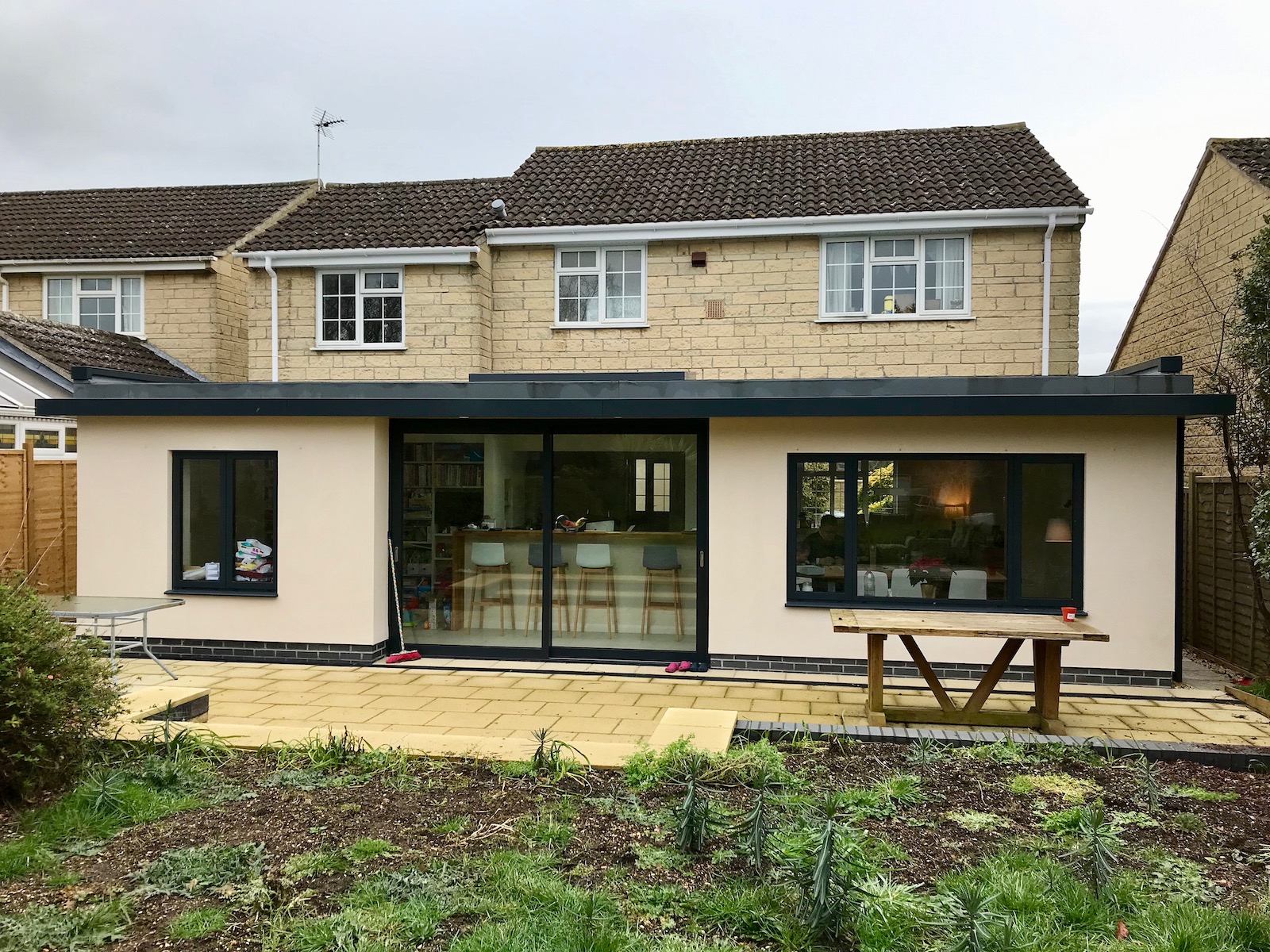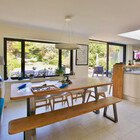 This 1970's estate home was too cramped for the growing family. After exploring several options for extending the ground floor and bedrooms, the back of the house was opened up to create a large open family room with dining area, kitchen and living room, a new cloakroom with shower and adequate coat and boot store. What a transformation!